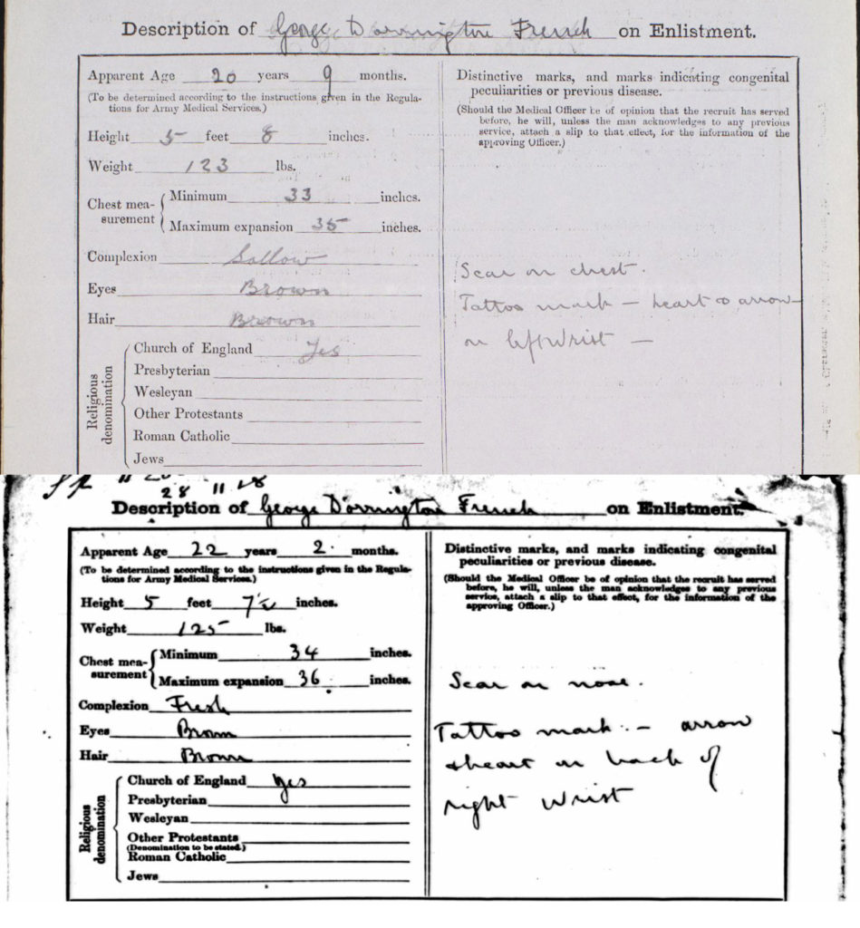 Whether the country air didn’t suit him or whether the lure of joining the army full-time was too much we will never know but in December 1902 George signed up for a “Short Service” with the Royal Garrison Artillery. Short service at this time meant 3 years with the colours (full time army) followed by 9 years in the reserve, the reserve being called back to full time duties if needed. Working on the farm for 20 months had obviously been good for George as his “Sallow” complexion had turned to “Fresh”, his weight had increased by a couple of pounds and his chest measurements had increased by an inch. More difficult to explain is the movement of his “arrow and heart” tattoo from his left wrist to his right.