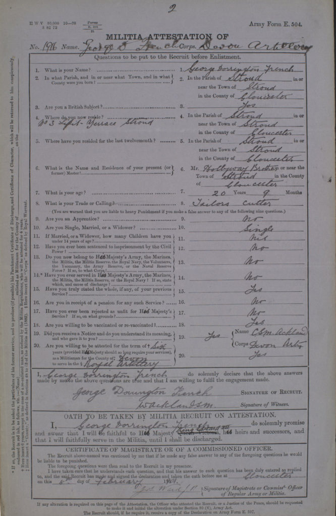 According to George’s attestation form he was living at 3, Lypiatt Terrace, in Stroud when he joined and was employed as a Tailor’s Cutter at Holloway Brothers in the town. [The Holloway brothers were one of the biggest employers in Stroud, with over 1500 workers making shirts and other clothing. They are said to have operated the first sewing machines powered by steam in the World]. The form also shows he was 5ft 8ins tall with a chest measurement of 33-35 ins, weight 124 lbs and having a sallow complexion with brown eyes and hair.